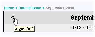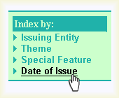 These pages archive the new stamp issues information chronologically. From the main Date of Issue index page, you can select which month you want to browse. Entries for each months are separated into three pages, each containing about 10 days of entries.There are two types of navigation used in these pages. First, if you click the arrow on the left and right of the month's name, this will brings you to the previous and next month pages respectively.