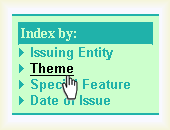 These pages archive the new stamp issues information according to their theme. From the main Theme index page, you can select which theme you want to browse. If there are very few entries for a particular theme, issues from different years will be grouped together into a single page. If there are many entries, each year will get individual page.
